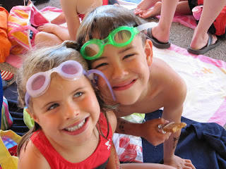 Last night was the first meet of the summer season. Jack is a veteran swim kid but this is Callie's first time on swim team and her first meet (she is 5.) We have spent a lot of time encouraging her and her coaches are awesome. They are so encouraging, supportive and really make it fun for the kids. Callie was thrilled to be hanging out with her big brother and other "big" kids in the bullpen. Her favorite part was definately decorating herself with permanent marker. After getting her race information on her arm, she got free reign to decorate as much as she wanted. Overall it was a fantastic night. Callie did both of her races without stopping (she takes a lot of breaks during practice.) It was one of those "I feel so proud I could cry" moments. Jack was a superstar and all of his year round practice shone through. It's going to be a great swim season!!